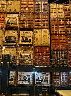 Un conteneur réfrigéré ou conteneur frigorifique[37] est un conteneur capable de maintenir une certaine température quelles que soient les conditions extérieures. Son contrôle est assuré par une transmission de ses paramètres à la passerelle[38]. Le principe du conteneur est basé sur un dispositif de production de froid alimenté en courant par des prises électriques spéciales sur le moyen de transport, le plus souvent des porte-conteneurs. Sauf produits spéciaux nécessitant de l'air extérieur, seul l'air intérieur est refroidi via un moteur à l'arrière du conteneur. Cet air circule ensuite par le plancher pour se propager dans tout le conteneur uniformément puis remonte vers le haut du conteneur. Une fois arrivé en haut, l'air est capté par le moteur puis refroidi et réinjecté dans le système[39].