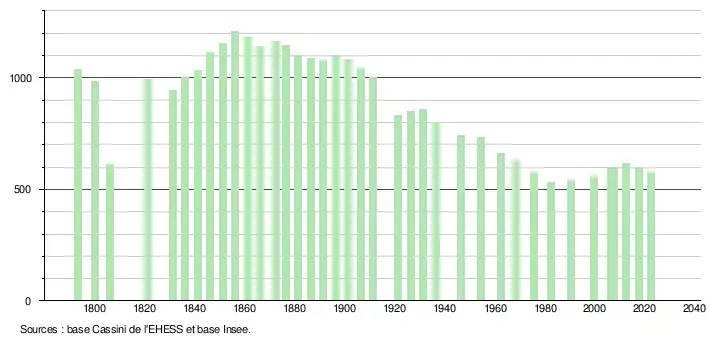 L'évolution du nombre d'habitants est connue à travers les recensements de la population effectués dans la commune depuis 1793. Pour les communes de moins de 10 000 habitants, une enquête de recensement portant sur toute la population est réalisée tous les cinq ans, les populations de référence des années intermédiaires étant quant à elles estimées par interpolation ou extrapolation[24]. Pour la commune, le premier recensement exhaustif entrant dans le cadre du nouveau dispositif a été réalisé en 2007[25].