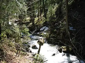 • Sur le domaine amont, le cours d’eau est étroit. Hormis en zones très froide, de très haute montagne et désertique ou urbaine, sa ripisylve est généralement très développée. Une faible luminosité et de forts taux de dilution des éléments inorganiques peuvent alors inhiber la production de matière organique par photosynthèse (production primaire) mais de grandes quantités de matière organique allochtone tombent dans le ruisseau. Par conséquent, la respiration (transformation de la matière organique en éléments minéraux) est plus importante que la production primaire (rapport Production/Respiration[Quoi ?] < 1, hétérotrophie). C’est dans ce domaine que la diversité des ressources trophiques disponibles est la plus grande.