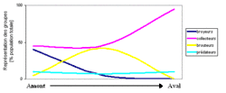 Du fait de l’évolution du matériel organique disponible, la représentation de ces différents groupes varient de l’amont vers l’aval du cours d’eau. En amont, c’est-à-dire dans la partie torrentielle, où le matériel organique grossier est abondant, on trouve une forte proportion de broyeurs mais aussi de collecteurs et les brouteurs sont peu représentés. La proportion de brouteurs augmente ensuite, ainsi que celle des collecteurs, au détriment des broyeurs dont les populations régressent significativement, pour finalement disparaître complètement. En aval, où subsiste presque uniquement le matériel organique particulaire, les collecteurs constituent le groupe dominant. Quant aux prédateurs, leur proportion reste toujours à peu près constante ; seule varie la représentation des espèces au sein du groupe, qui suit l’évolution des proies disponibles. Des variations atypiques dans la répartition des différents groupes invertébrés le long d’un cours d’eau sont le signe d’une perturbation du milieu naturel.