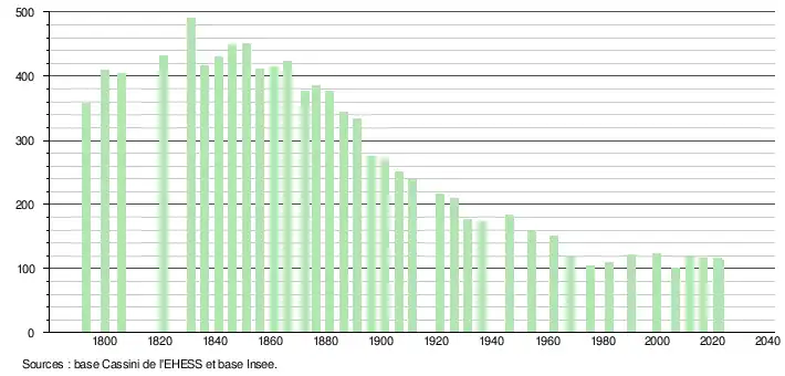 L'évolution du nombre d'habitants est connue à travers les recensements de la population effectués dans la commune depuis 1793. Pour les communes de moins de 10 000 habitants, une enquête de recensement portant sur toute la population est réalisée tous les cinq ans, les populations de référence des années intermédiaires étant quant à elles estimées par interpolation ou extrapolation[20]. Pour la commune, le premier recensement exhaustif entrant dans le cadre du nouveau dispositif a été réalisé en 2006[21].