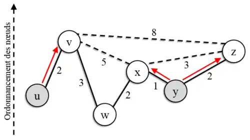 - ↑ La valeur totale de ce chemin est 4 + 1 = 5, supérieure à celle du chemin B-D-E, qui est le plus court chemin de B à E. La contraction portant sur le nœud C, le chemin B-C-E n'est pas retenu par le calcul de l'algorithme de contraction.