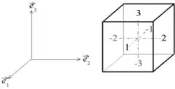 Un solide est décrit dans un repère orthonormé direct. Considérons un cube de matière de côté a dont les faces sont normales aux axes du repère. Numérotons ses faces :