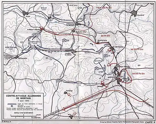 Le 2/120e régiment de la 30e DI américaine (avec la compagnie K du 3/120), environ 700 hommes[15], parfaitement camouflé sur la cote 314, reste encerclé pendant cinq jours sans céder un pouce de terrain. La position occupée par ce régiment commande toutes les approches de Mortain et dispose d'un point de vue sur toute la vallée. Depuis cette position, il est possible de diriger des tirs de harcèlement d'une redoutable précision sur la division Das Reich, ce qui gêne tous ses mouvements. Devant ce contretemps, von Funck décide d'engager la 1re Panzer SS pour au moins atteindre Juvigny-le-Tertre[16]. Dans la nuit, cette division est fortement retardée dans un défilé par le crash d'un chasseur-bombardier américain sur sa tête de colonne. Puis, en progressant vers ses objectifs, elle percute le Groupement Tactique B (CCB) de la 3e division blindée américaine et ne parvient plus dès lors à avancer.