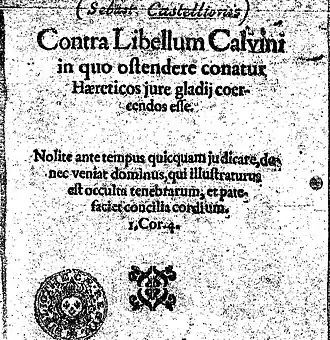 Castellion, qui est réfugié à Bâle, entreprend d'écrire contre Calvin[1]. En , il pubie le Traité des Hérétiques, où il s'oppose à la théologie qui sous-tend les persécutions contre les hérétiques[1],[2],[3].
