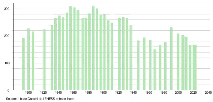 L'évolution du nombre d'habitants est connue à travers les recensements de la population effectués dans la commune depuis 1793. Pour les communes de moins de 10 000 habitants, une enquête de recensement portant sur toute la population est réalisée tous les cinq ans, les populations de référence des années intermédiaires étant quant à elles estimées par interpolation ou extrapolation[20]. Pour la commune, le premier recensement exhaustif entrant dans le cadre du nouveau dispositif a été réalisé en 2005[21].