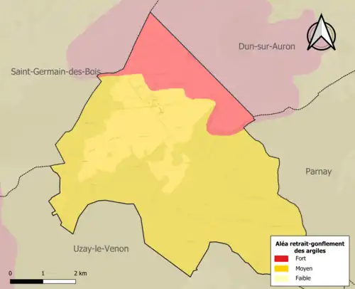 La commune est vulnérable au risque de mouvements de terrains constitué principalement du retrait-gonflement des sols argileux[13]. Cet aléa est susceptible d'engendrer des dommages importants aux bâtiments en cas d’alternance de périodes de sécheresse et de pluie. La totalité de la commune est en aléa moyen ou fort (90 % au niveau départemental et 48,5 % au niveau national). Sur les 14 bâtiments dénombrés sur la commune en 2019, 14 sont en aléa moyen ou fort, soit 100 %, à comparer aux 83 % au niveau départemental et 54 % au niveau national. Une cartographie de l'exposition du territoire national au retrait gonflement des sols argileux est disponible sur le site du BRGM[14],[Carte 2].