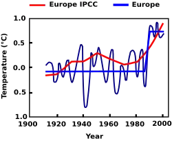 De façon similaire, le forçage anthropique seul ne pouvait expliquer le réchauffement de la période 1910-1945, mais se révélait nécessaire pour simuler le réchauffement depuis 1976. Cependant, en combinant tous ces facteurs intervenants, l'équipe de Stott fut en mesure de simuler précisément les changements de températures planétaires au cours du XXe siècle. Ils prédirent que l'émission continue de gaz à effets de serre causerait des montées de température futures « à un rythme similaire à celui qu'on a pu observer durant les dernières décennies »[112]. Un graphique[113] de la relation entre les facteurs naturels et anthropiques contribuant au changement de climat est reproduite sur le rapport Climate Change 2001: The Scientific Basis[113] du GIEC.