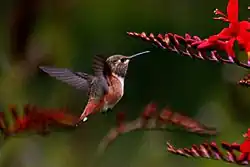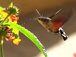 L’oiseau-mouche (à gauche) et le moro-sphinx (Lepidoptera, Sphingidae) (à droite) ont en commun un bec et une trompe de longueur adaptée pour puiser le nectar et une capacité au vol stationnaire. | ||