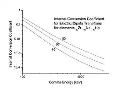 Lorsque le numéro atomique (Z) augmente et que l'énergie du rayon gamma diminue, les coefficients de conversion interne augmentent. Par exemple, les coefficients de conversion interne calculés pour des transitions dipolaires électriques (E1), pour Z=40, 60 et 80, sont affichés sur la figure[12].