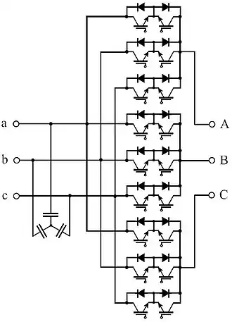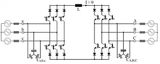 - Convertisseurs indirects AC-AC (ou AC-CC-AC) (c'est-à-dire avec redresseur, liaison CC et onduleur)[2], tels que ceux utilisés dans les variateur électronique de vitesse.