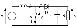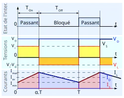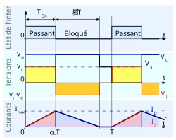 - une phase d'accumulation d'énergie : lorsque l'interrupteur S (voir figure 1) est fermé (état passant), cela entraîne l'augmentation du courant dans l'inductance donc le stockage d'une quantité d'énergie sous forme d'énergie magnétique. La diode D est alors bloquée et la charge est alors déconnectée de l'alimentation ;