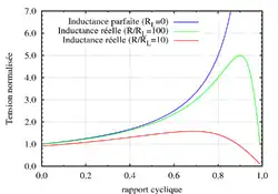 Si la résistance de l'inductance est nulle, on retrouve l'équation obtenue dans le cas idéal, mais plus RL augmente, plus le gain en tension du convertisseur diminue par rapport au cas idéal. De plus l'influence de RL augmente avec le rapport cyclique (Voir figure 6).