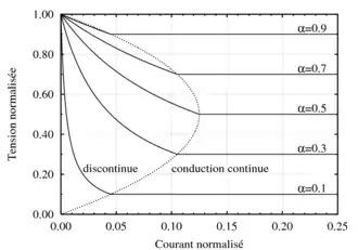 La figure de droite présente la limite entre conduction discontinue et continue, elle est tracée à partir des deux équations ci-dessus. La première permet de trouver la limite et la deuxième, l'allure de la courbe en discontinue.