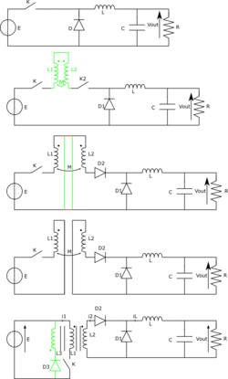 Dans le montage non isolé (1), on ajoute deux inductances couplées entre l'interrupteur K et la diode D. Cet ajout ne modifie pas le fonctionnement du circuit. En effet, le circuit magnétique est supposé parfait, il n'y a donc pas de fuites et donc [2]. Il est également possible de scinder l'interrupteur en deux interrupteurs K et K2 commandés en synchronisme (2).