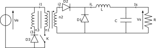 Le troisième enroulement L3 est une inductance de démagnétisation. Pour un transformateur ayant une permittivité magnétique finie, la relation entre les courants est (5). Il est donc nécessaire de démagnétiser le transformateur à chaque cycle. Ce qui est assuré par le 3e enroulement et la diode D3