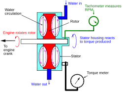 Pour les bancs d'essai où l'on a besoin de connaître le moment du couple d'un arbre, on utilise un peson monté sur une console liée au bâti du moteur, et perpendiculaire à la bielle d'entrée. Le carter de la turbine, ou stator, est monté sur des roulements à rouleaux, et l'arbre est lui-même monté sur des roulements à rouleaux faisant l'interface avec le stator afin qu'il puisse tourner indépendamment. Le peson se trouve entre le bâti et le stator de la turbine, qui a tendance à tourner en sens inverse de l'arbre de la turbine (troisième loi de Newton).