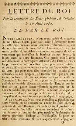 A CES CAUSES, nous vous avertissons et signifions que notre volonté est de commencer à tenir les Etats libres et généraux de notre royaume, au lundi 27 avril prochain, en notre ville de Versailles, où nous entendons et désirons que se trouvent aucuns des plus notables personnages de chaque province, bailliage et sénéchaussée. Et pour cet effet vous mandons et très-expressément enjoignons qu'incontinent, la présente reçue, vous ayez à convoquer et assembler en notre ville de dans le plus bref temps que faire se pourra tous ceux des trois Etats du bailliage (ou sénéchaussée de...) pour conférer et pour communiquer ensemble, tant des remontrances, plaintes et doléances, que des moyens et avis qu'ils auront à proposer en l'assemblée générale de nosdits Etats; et ce fait, élire, choisir et nommer sans plus de chaque ordre, tous personnages dignes de cette grande marque de confiance, par leur intégrité et par le bon esprit dont ils seront animés : lesquelles convocations et élections seront faites dans les formes prescrites pour tout le royaume par le règlement annexé aux présentes lettres; et seront lesdits députés munis d'instructions et pouvoirs généraux et suffisants pour proposer, remontrer, aviser et consentir tout ce qui peut concerner les besoins de l'Etat, la réforme des abus, l'établissement d'un ordre fixe et durable dans toutes les parties de l'administration, la prospérité générale de notre royaume, et le bien de tous et chacun de nos sujets : les assurant que de notre part ils trouveront toute volonté et affection pour maintenir et faire exécuter ce qui aura été concerté entre nous et lesdits Etats, soit relativement aux impôts qu'ils auront consentis, soit pour l'établissement d'une règle constante dans toutes les parties de l'administration et de l'ordre public; leur promettant'de demander et d'écouter favorablement leurs avis sur tout ce qui peut intéresser le bien de nos peuples, et de pourvoir sur les doléances et propositions qu'ils auront faites, de telle manière que notre royaume, et tous nos sujets en particulier, ressentent pour toujours les effets salutaires qu'ils doivent se promettre d'une telle et si notable assemblée.