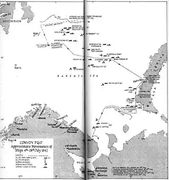 Le convoi PQ 17[1] qui fit le voyage en 1942 est entré dans la légende par les pertes qu'il a subies. Il perdit 26 des 37 navires qui le composaient.