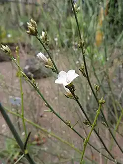 Les fleurs sont groupées en inflorescences de 1 à 5-6 fleurs : des cymes pédonculées, terminales et axillaires. Les pédoncules mesurent de 2 à 7 (parfois 11) mm, et sont pubescents. Les bractéoles mesurent 2-3 × 1 mm, et sont lancéolées, acuminées, avec une base embrassante, apposées sur le calice, pubescentes. Les pédicelles mesurent de 3 à 7 mm, et sont trapus et pubescents. Les sépales externes mesurent 4-6 × 2-2,5 mm, et sont largement oblongs et mucronés. Les sépales intérieurs sont obovaux, rétrécis brusquement à un apex mucroné. La corolle mesure de 1 à 1,2 cm de long, et elle est blanche ou rosée, profondément lobée, avec des bandes médiopétalaires pileuses. L’ovaire et pileux. Le style est pileux, et divisé 3-4 mm au-dessus de la base. Les stigmates mesurent environ 3 mm. La capsule n’a pas été observée mais elle est vraisemblablement pileuse[4].