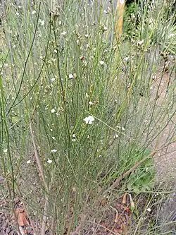 Il s’agit d’un arbuste mesurant jusqu’à 2 mètres dont les tiges chlorophylliennes et les petites feuilles sessiles, caduques, filiformes et appressées aux tiges[4] donne un aspect qui peut faire penser au genêt[5]. Les parties végétatives sont glabres ou pileuses peu épaisses. Les feuilles, sessiles et caduques, mesurent 0,5-4,5 × 0,1 mm et sont filiformes, aiguës, entières.