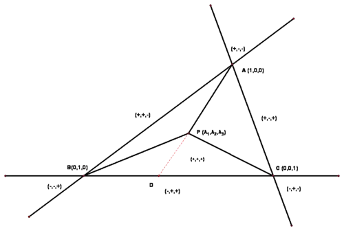En géométrie réelle, l'aire géométrique usuelle est la valeur absolue de l'aire algébrique. Le résultat vaut pour l'aire géométrique si le point est à l'intérieur du triangle. S'il est à l'extérieur, les signes des coefficients dépendent de l'orientation des triangles considérés (positif si l'orientation est la même que celle du triangle ABC, négative dans le cas contraire, voir schéma).