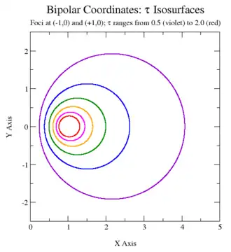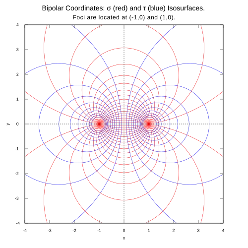 Cette équation montre que σ et τ sont respectivement les parties réelle et imaginaire d'une fonction analytique de x + iy (avec des points de branchement logarithmiques aux foyers), ce qui prouve (selon la théorie générale des transformations conformes) (les équations de Cauchy-Riemann) que ces courbes de σ et τ sont des faisceaux orthogonaux, et forment donc bien un système de coordonnées orthogonales.