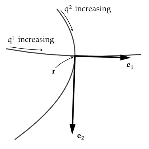 où r est un point donné et qi est la coordonnée pour laquelle on identifie le vecteur de base. En d'autres termes, la courbe où l'on fixe toutes les coordonnées sauf une peut être vue comme une courbe paramétrée par cette coordonnée, et la dérivée de la courbe par rapport au paramètre est exactement le vecteur de base associé à la coordonnée considérée dans le système de coordonnées orthogonales.