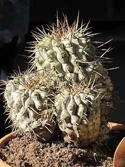 Son épiderme est de couleur blanche à cendrée. La couleur claire est une protection contre l'évaporation. En culture, l'épiderme peut rester de couleur verte. Les épines sont souvent de couleur noire avec des poils laineux au sommet des sujets âgés. Les fleurs sont de couleur jaune et mesurent de 1,5 à 2,5 cm de diamètre[réf. nécessaire].
