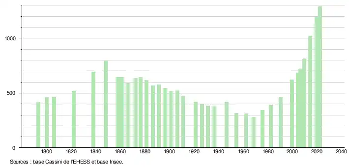 L'évolution du nombre d'habitants est connue à travers les recensements de la population effectués dans la commune depuis 1793. Pour les communes de moins de 10 000 habitants, une enquête de recensement portant sur toute la population est réalisée tous les cinq ans, les populations de référence des années intermédiaires étant quant à elles estimées par interpolation ou extrapolation[14]. Pour la commune, le premier recensement exhaustif entrant dans le cadre du nouveau dispositif a été réalisé en 2004[15].