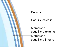Dans le cas de l'œuf de poule, elle est constituée à 95,1 % d'éléments minéraux, notamment de carbonate de calcium sous forme de calcite cristallisée ou amorphe, mais aussi 3,3 % de protéines qui constituent la trame initiale de la coquille et de 1,6 % d'eau. Sa coquille a de 7 000 à 15 000 pores (soit une densité de 70 à 200 par centimètre carré, formant des entonnoirs de 10 µm de large dans leur partie la plus étroite, obturés en surface par des bouchons de cuticule)[1] et est divisée en six couches (Wilhelm von Nathusius (de) est le premier au XIXe siècle à décrire cette structure) : au plus près du blanc, deux membranes coquillières constituées de fibres de structure proche du collagène, la membrane interne faisant 20 µm d'épaisseur et la biominéralisation étant commencée au niveau de la membrane externe de 50 µm d'épaisseur[2] ; par-dessus la couche mamillaire de 70 µm d’épaisseur, est constituée à la base de noyaux mamillaires qui commencent la minéralisation de cristaux de carbonate de calcium en forme de cônes (cette structure de croissance radiaire étant appelée mamilla) ; une couche palissadique de 200 µm d’épaisseur très compacte résultant de la fusion des cônes adjacents ; une monocouche de cristaux de calcite verticaux de 10 µm d'épaisseur ; la cuticule de 10 µm d'épaisseur, composée principalement de matière organique et de pigments responsables de la teinte de l'œuf[3].