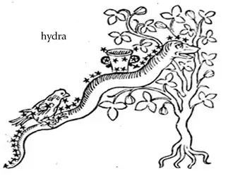 La figure de Corvus avec Hydra et Crater dans l’édition du Poeticon astronomicon d’Hyginus de 1482 (image inversée).