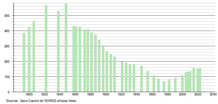 L'évolution du nombre d'habitants est connue à travers les recensements de la population effectués dans la commune depuis 1793. Pour les communes de moins de 10 000 habitants, une enquête de recensement portant sur toute la population est réalisée tous les cinq ans, les populations de référence des années intermédiaires étant quant à elles estimées par interpolation ou extrapolation[16]. Pour la commune, le premier recensement exhaustif entrant dans le cadre du nouveau dispositif a été réalisé en 2004[17].