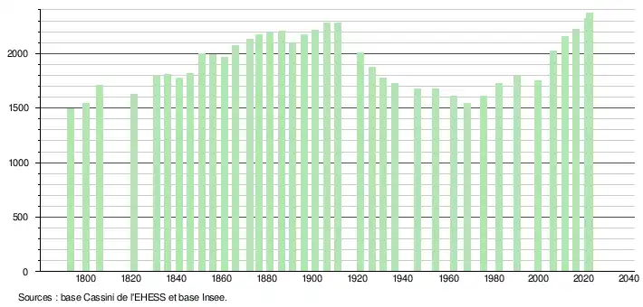 L'évolution du nombre d'habitants est connue à travers les recensements de la population effectués dans la commune depuis 1793. Pour les communes de moins de 10 000 habitants, une enquête de recensement portant sur toute la population est réalisée tous les cinq ans, les populations de référence des années intermédiaires étant quant à elles estimées par interpolation ou extrapolation[18]. Pour la commune, le premier recensement exhaustif entrant dans le cadre du nouveau dispositif a été réalisé en 2006[19].