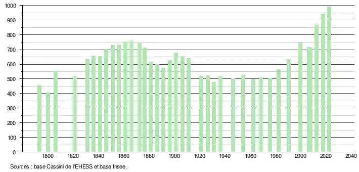 L'évolution du nombre d'habitants est connue à travers les recensements de la population effectués dans la commune depuis 1793. Pour les communes de moins de 10 000 habitants, une enquête de recensement portant sur toute la population est réalisée tous les cinq ans, les populations de référence des années intermédiaires étant quant à elles estimées par interpolation ou extrapolation[16]. Pour la commune, le premier recensement exhaustif entrant dans le cadre du nouveau dispositif a été réalisé en 2007[17].