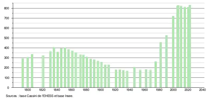 L'évolution du nombre d'habitants est connue à travers les recensements de la population effectués dans la commune depuis 1793. Pour les communes de moins de 10 000 habitants, une enquête de recensement portant sur toute la population est réalisée tous les cinq ans, les populations de référence des années intermédiaires étant quant à elles estimées par interpolation ou extrapolation[14]. Pour la commune, le premier recensement exhaustif entrant dans le cadre du nouveau dispositif a été réalisé en 2005[15].