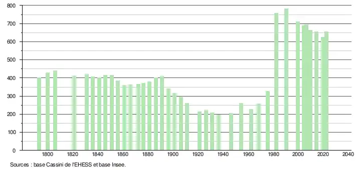 L'évolution du nombre d'habitants est connue à travers les recensements de la population effectués dans la commune depuis 1793. Pour les communes de moins de 10 000 habitants, une enquête de recensement portant sur toute la population est réalisée tous les cinq ans, les populations de référence des années intermédiaires étant quant à elles estimées par interpolation ou extrapolation[12]. Pour la commune, le premier recensement exhaustif entrant dans le cadre du nouveau dispositif a été réalisé en 2004[13].