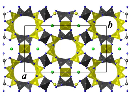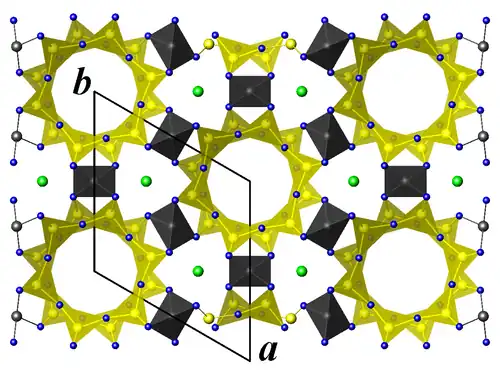 Cordiérite : structure. En vert : atomes de magnésium, en bleu : oxygène. Les sites tétraédriques en jaune sont occupés par le silicium, ceux en gris par l'aluminium.