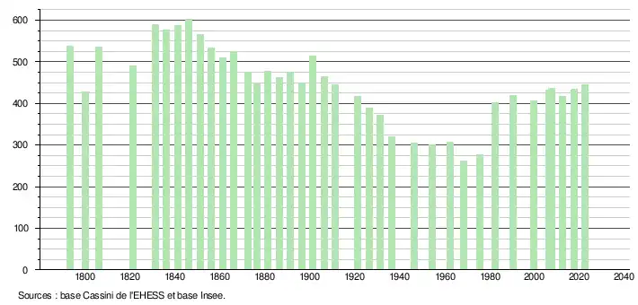 L'évolution du nombre d'habitants est connue à travers les recensements de la population effectués dans la commune depuis 1793. Pour les communes de moins de 10 000 habitants, une enquête de recensement portant sur toute la population est réalisée tous les cinq ans, les populations de référence des années intermédiaires étant quant à elles estimées par interpolation ou extrapolation[31]. Pour la commune, le premier recensement exhaustif entrant dans le cadre du nouveau dispositif a été réalisé en 2007[32].
