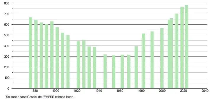 L'évolution du nombre d'habitants est connue à travers les recensements de la population effectués dans la commune depuis 1876. Pour les communes de moins de 10 000 habitants, une enquête de recensement portant sur toute la population est réalisée tous les cinq ans, les populations de référence des années intermédiaires étant quant à elles estimées par interpolation ou extrapolation[29]. Pour la commune, le premier recensement exhaustif entrant dans le cadre du nouveau dispositif a été réalisé en 2008[30].