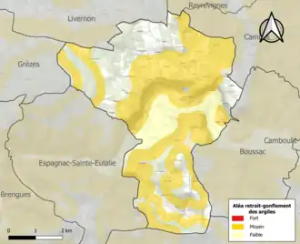 Le retrait-gonflement des sols argileux est susceptible d'engendrer des dommages importants aux bâtiments en cas d’alternance de périodes de sécheresse et de pluie. 57,8 % de la superficie communale est en aléa moyen ou fort (67,7 % au niveau départemental et 48,5 % au niveau national). Sur les 170 bâtiments dénombrés sur la commune en 2019, 129 sont en aléa moyen ou fort, soit 76 %, à comparer aux 72 % au niveau départemental et 54 % au niveau national. Une cartographie de l'exposition du territoire national au retrait gonflement des sols argileux est disponible sur le site du BRGM[31],[Carte 2].