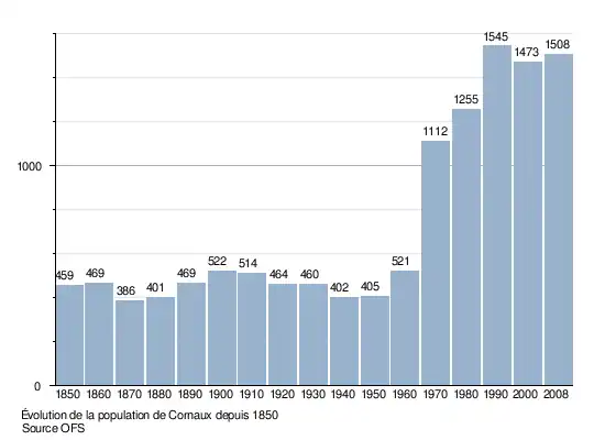 Le graphique suivant résume l'évolution de la population de Cornaux entre 1850 et 2008[5] :
