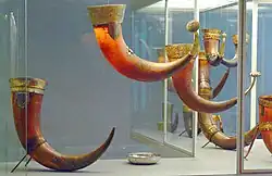 Mais l'usage de cornes à boire n'était pas limité à l'Europe. On a en effet retrouvé de par le monde scythique de nombreuses cornes dorées et leur représentation sur des plaques d'or gravées[4]. On connaît d'autres indices de leur usage en Afrique et en Amérique précolombienne.