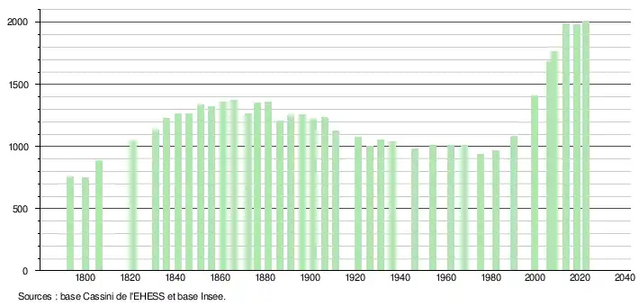 L'évolution du nombre d'habitants est connue à travers les recensements de la population effectués dans la commune depuis 1793. Pour les communes de moins de 10 000 habitants, une enquête de recensement portant sur toute la population est réalisée tous les cinq ans, les populations de référence des années intermédiaires étant quant à elles estimées par interpolation ou extrapolation[35]. Pour la commune, le premier recensement exhaustif entrant dans le cadre du nouveau dispositif a été réalisé en 2008[36].