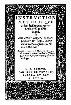 - Instruction de musique, par C. de Blockland, natif de Montfort en Hollande. Lyon : Jean II de Tournes, 1573. in-8o, 59 p. Guillo 1991 no 85, Cartier no 555, RISM B-VI 155 p., Davidsson 1962 no 62.