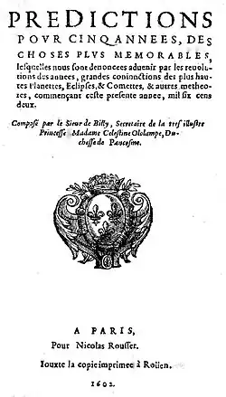 - Prédictions pour cinq années des choses plus memorables, lesquelles nous sont dénoncées advenir par les révolutions des années, grandes conjonctions des plus hautes planettes, eclipses, & comettes, & autres metheores, commençant ceste présente année mil six cens deux, composé par le sieur de Billy, secrétaire de la tres illustre princesse Madame Celestine Ololampe, duchesse de Paucefine… - Paris : pour N. Rousset ; jouxte la copie imprimée à Rouen, 1602. in-8o, 13 p. Paris BNF. Numérisé sur Gallica.