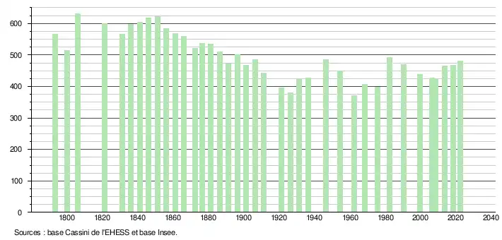 L'évolution du nombre d'habitants est connue à travers les recensements de la population effectués dans la commune depuis 1793. Pour les communes de moins de 10 000 habitants, une enquête de recensement portant sur toute la population est réalisée tous les cinq ans, les populations de référence des années intermédiaires étant quant à elles estimées par interpolation ou extrapolation[22]. Pour la commune, le premier recensement exhaustif entrant dans le cadre du nouveau dispositif a été réalisé en 2008[23].