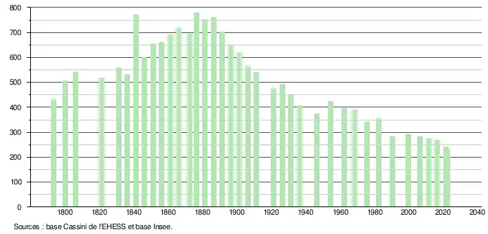 L'évolution du nombre d'habitants est connue à travers les recensements de la population effectués dans la commune depuis 1793. Pour les communes de moins de 10 000 habitants, une enquête de recensement portant sur toute la population est réalisée tous les cinq ans, les populations de référence des années intermédiaires étant quant à elles estimées par interpolation ou extrapolation[22]. Pour la commune, le premier recensement exhaustif entrant dans le cadre du nouveau dispositif a été réalisé en 2006[23].