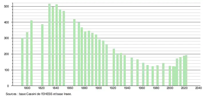 L'évolution du nombre d'habitants est connue à travers les recensements de la population effectués dans la commune depuis 1793. Pour les communes de moins de 10 000 habitants, une enquête de recensement portant sur toute la population est réalisée tous les cinq ans, les populations de référence des années intermédiaires étant quant à elles estimées par interpolation ou extrapolation[15]. Pour la commune, le premier recensement exhaustif entrant dans le cadre du nouveau dispositif a été réalisé en 2004[16].