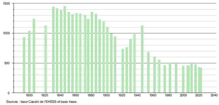 L'évolution du nombre d'habitants est connue à travers les recensements de la population effectués dans la commune depuis 1793. Pour les communes de moins de 10 000 habitants, une enquête de recensement portant sur toute la population est réalisée tous les cinq ans, les populations de référence des années intermédiaires étant quant à elles estimées par interpolation ou extrapolation[25]. Pour la commune, le premier recensement exhaustif entrant dans le cadre du nouveau dispositif a été réalisé en 2005[26].